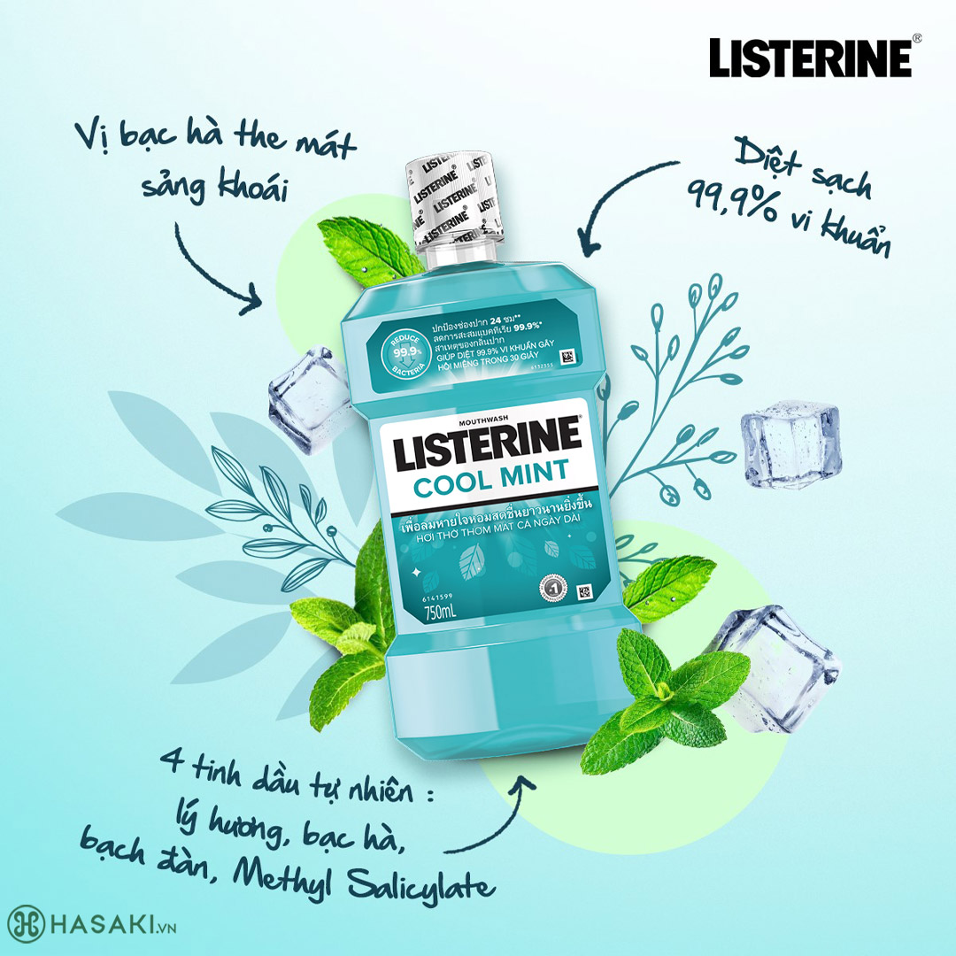 Nước Súc Miệng Listerine Cool Mint Mouthwash – vị Bạc Hà the cay mát lạnh, cho cảm giác sảng khoái sau mỗi lần sử dụng, thích hợp cho người lớn.